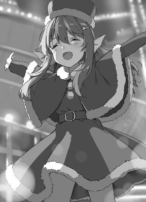 In Myu’s case, she looked like a mermaid Santa, since she was wearing a fur-lined red hat and coat, as well as warm white stockings and fur-lined boots. She truly looked adorable. Hajime picked her up off his shoulders and put her on the ground. As she looked confusedly up at him, he pulled out his phone and started taking a ton of pictures. He then put his phone away at lightning speed and placed Myu back on his shoulders as if nothing had happened. Even when he drew Donner and Schlag, his hands didn’t move that fast.