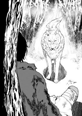 The white wolf’s long face was right there next to his own. The creature must have circled around to the thicket behind him and approached him from that side. It was holding some sort of scarlet fruit in its large mouth, and regarding the panicking man sitting on the ground with a luminous gaze.