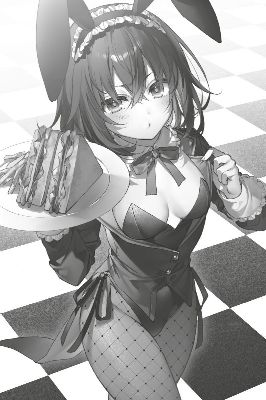 Standing there, holding a tray of snacks, was none other than Shary. Her usual maid’s uniform was nowhere to be seen, however. She wore a hair band with bunny ears, a fluffy tail, and was dressed in a bunny suit complete with fishnet stockings. Coupled with her dusk-colored eyes, she looked like a real bunny.