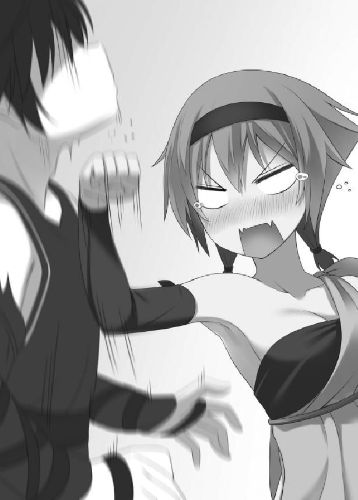 A mischievous grin spread wide across her face, and she slowly inched her way up to Yuuto. Naturally, she did so while leaning forward in a way that emphasized her cleavage.