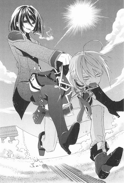 "Jutte — so it's actually a pair of crossed rods <Rosario>. The black metal should be an alloy of chrome and ceramic. It's a very tough and light material, and its weakness towards heat is removed as well." [TLNote: 十手 (Jutte), a Japanese weapon. As for the 十字昆 <ロザリオ> (crossed rods <Rosario>), it's probably referring to weapons that form a cross when the two rods/sticks/whatever crisscrossed with each other. The kanji + furigana combination is probably a term coined up by the author]