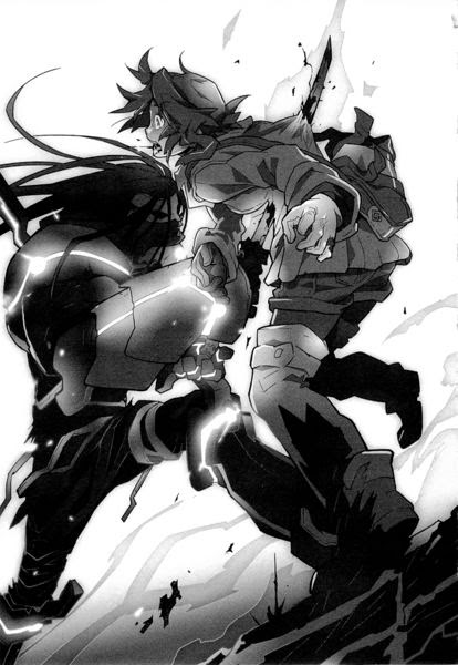 Although Kyouko had no martial arts training, the body of Adventurers had the ability to toy with a bear in battle. Her attacks were absorbed and devoured by the sword. The single blade in the man's right arm seem to split into thousands of copies to protect the man and cut up Kyouko.