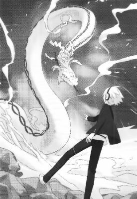 Izayoi was pointing at a barely visible long and white something floating in the river. Before Kuro Usagi comprehended what that was, the huge body raised its curved neck and said: