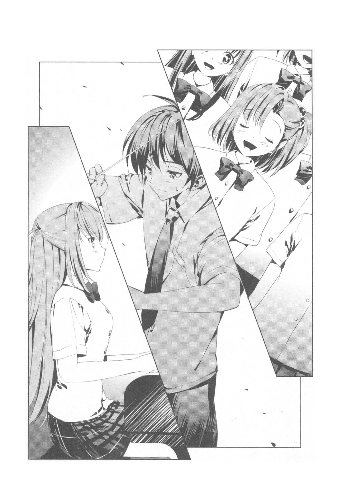 I walked down the corridor and pushed open the heavy double doors of the music hall. The performance had reached the final chorus of <Ave verum corpus> and was fading into the dark. I looked at the stage and was surprised at what I saw. The long hair tied into two braids—I recognized the back of Kagurazaka-senpai in an instant. She was standing right in the middle of the stage, and facing her, was the ensemble of her class, whose grey silhouettes were arranged neatly on the terraced stage.
