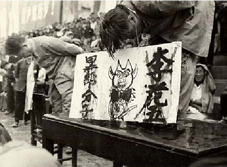 Struggle session. The victims were made to wear boards with their name and the criminal offence of "anti-revolutionarist" along with other humiliating words and drawings, and then paraded in front of the public.