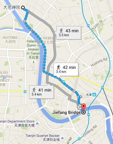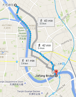 Google maps showing the route from the temple to Liberation Bridge. Note the Hutong District where the Lius live and the Ch’üanyeh Bazaar mentioned in chapter 1.
