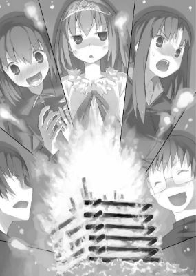 It was already dusk. A large crowd of spectators smoothly took their places at the athletic field where the cool autumn wind blew. They clapped their hands together in rhythm as they waited for the event to commence. Taiga sat in a chair at the goal line, wearing a red cloak under the illumination of the floodlights. A protective ring of members from the student council and the acting committee surrounded her. As though to warn everyone off from approaching the prize, they eyed the participants as they stood unyieldingly at parade rest.