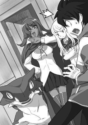 "That... is your familiar?" Kirche asked somewhat mockingly, pointing at Saito.